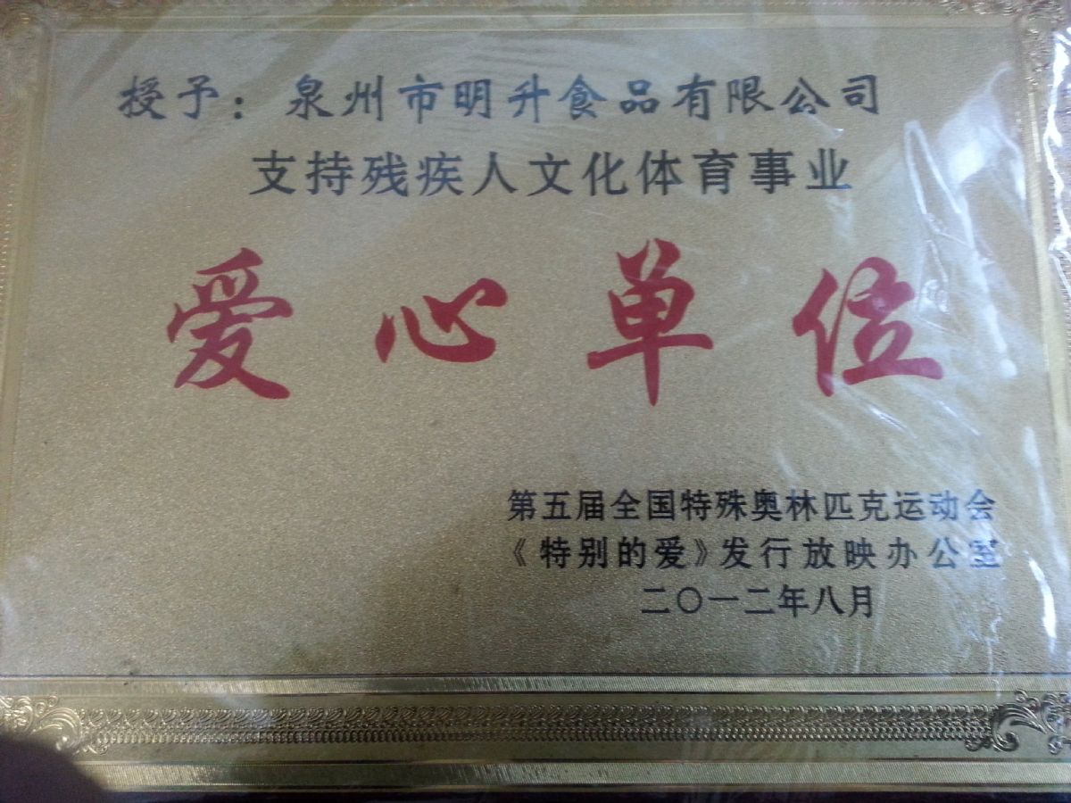 2012年8月,第五届全国特殊奥林匹克运动会《特别的爱》发行放映办公室授予泉州市明升食品有限公司支持残疾人文化体育事业爱心单位的荣誉称号。