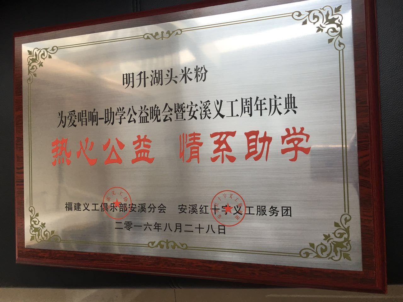 2016年8月,明升湖头米粉成为《为爱唱响、助学公益晚会暨安溪义工周年庆典》 赞助单位。